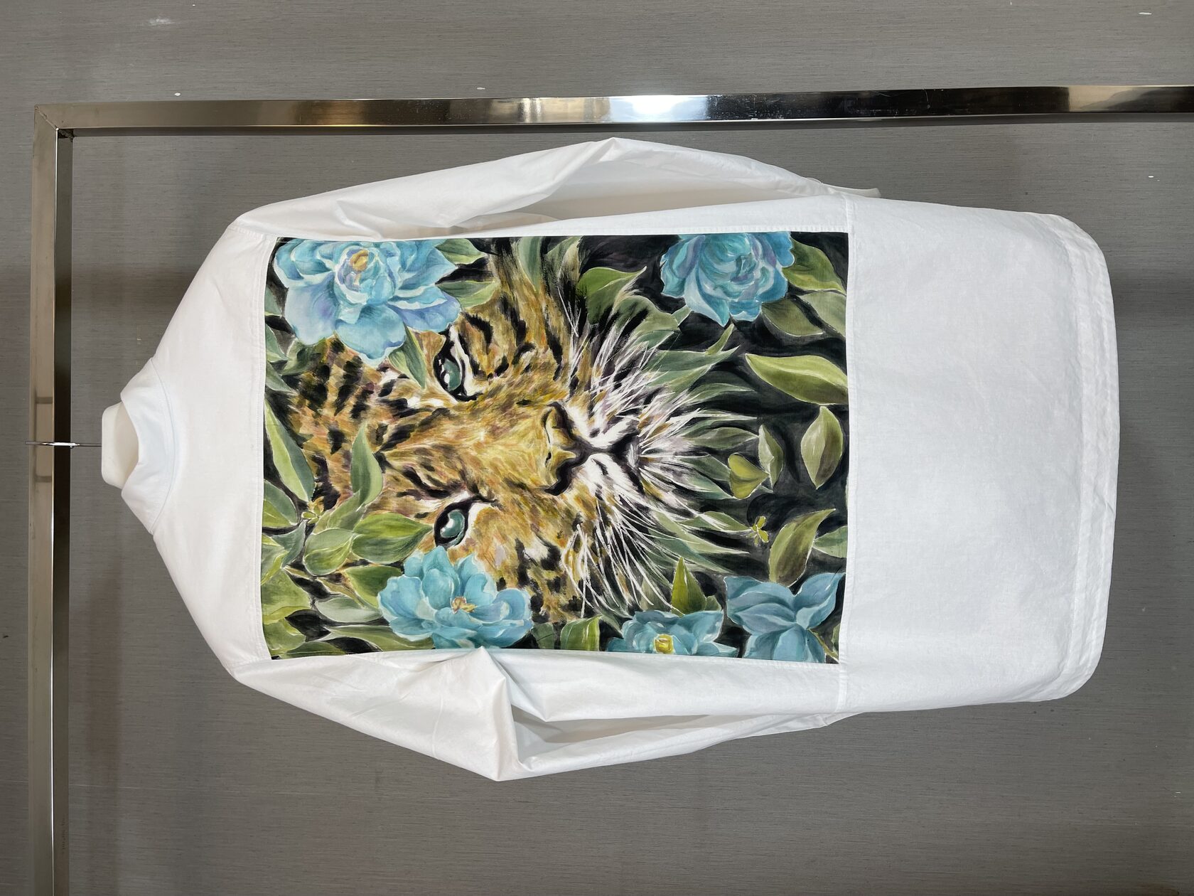 Маркеры фиксируются на ткани утюгом. После росписи отправляем принт в пошив. Нас ждёт белая рубашка с шелковым принтом на спине.