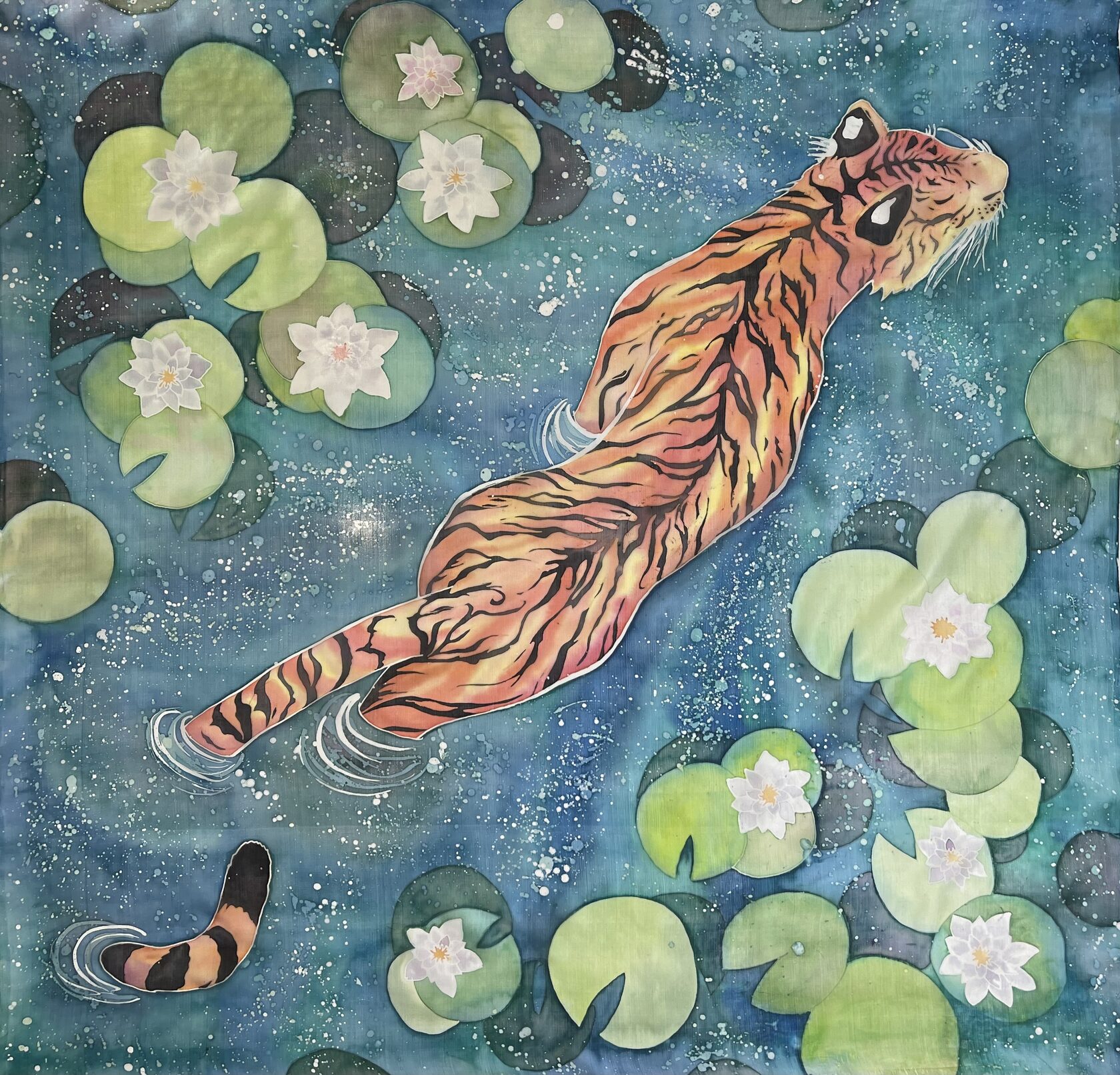 Второй слой росписи - это светлые оттенки воды и кувшинок (и это промежуточный слой, будут еще 2), а также желто-рыжий фон для тигра (и для него это окончательный фон, по нему мы будем делать черные полоски). По этому фону мы так же, как и по белому, делаем набрызг воском и обводим резервом часть кувшинок, которая останется у нас светло-зеленой.