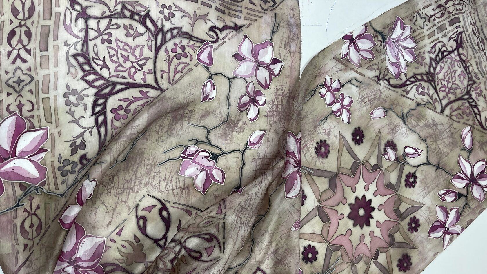 В цветах по нежно-розовому даем слой воска. Наносим мазки рядом с предыдущими. Старайтесь лепить воском форму цветка. Горячий батик является способом передать объем предмета, нанося последовательно оттенки от самых светлых до темных. После воска сразу расписываем цветы грязно-розовым, затемняя в середине. Когда краска высохнет, наносим резерв в серединку цветка и заливаем самый темный оттенок. Цветы готовы.