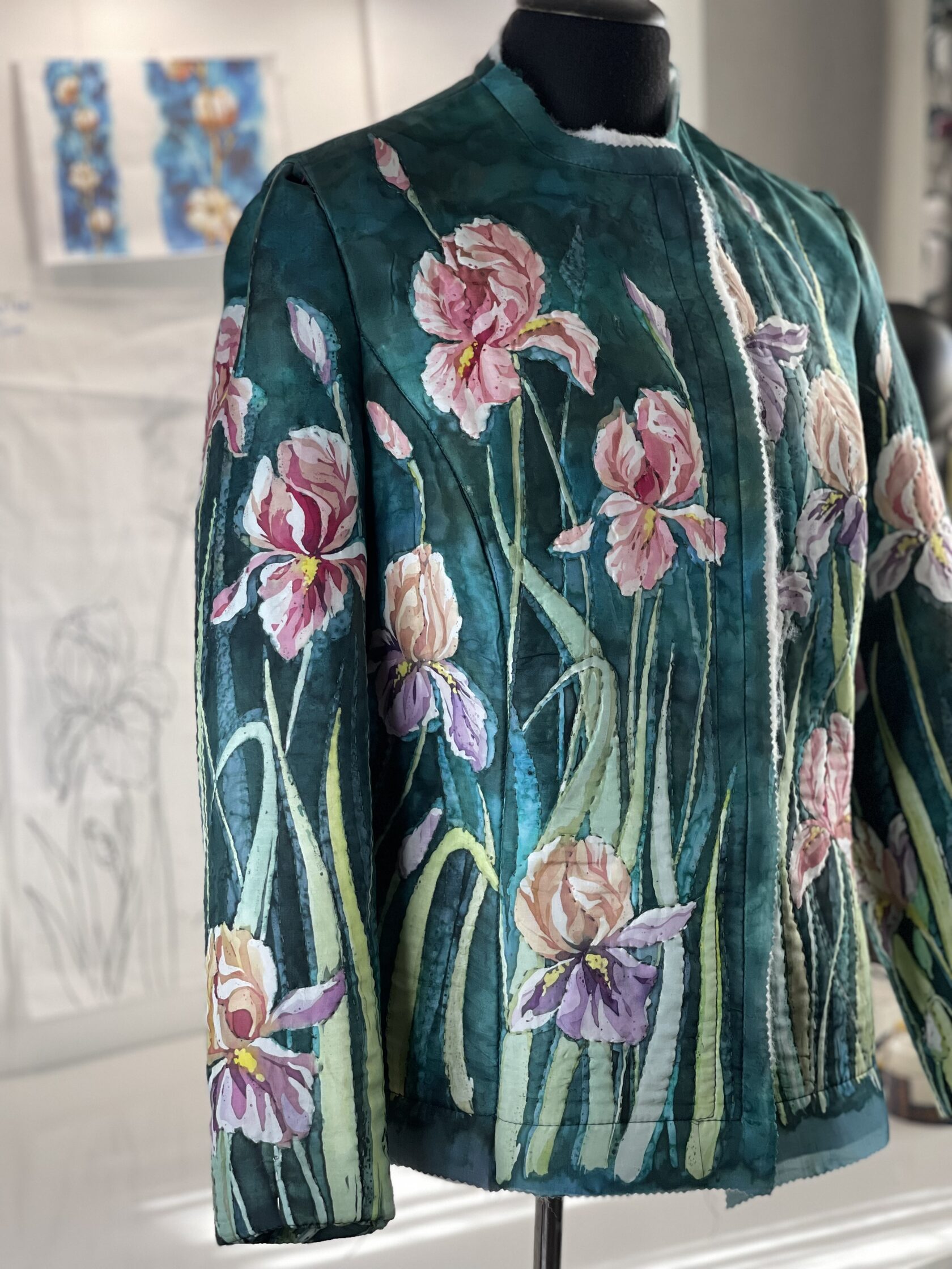 Не стоит думать, что достаточно просто расписать куски ткани, а затем уже кроить из нее изделие, как обычное. В этом случае оно и получится обычное. Изделие из батика же требует индивидуального подхода к эскизу для лекал. Каждый эскиз должен быть разработан отдельно под выкройку, учитывая все законы композиции. Таким образом вы подчеркнете, что это не просто очередная одежда, а эксклюзивная вещь, созданная продуманно и индивидуально. Только благодаря композиции рисунка вы сможете подчеркнуть, что перед зрителем не обычная одежда, что нельзя найти так напечатанную под изделие ткань. Что это роспись, ручная работа. Поэтому прорабатываем рисунок осмысленно, используя для удобства копирования кальку. Я прорисовываю рисунок сначала ручкой, а затем уже уверенно маркером. Каждое лекало укладывается на выкройке заранее, учитывая долевую нить. С большими припусками на усадку ткани, на стежку и т.д. Такие эскизы позволяют выполнять изделие не раз. Просто сохраните его до следующего заказа. В этом видео я также показываю, как можно нарисовать рисунок ирисов в другой технике: холодный батик, немного горячего батика и соль.