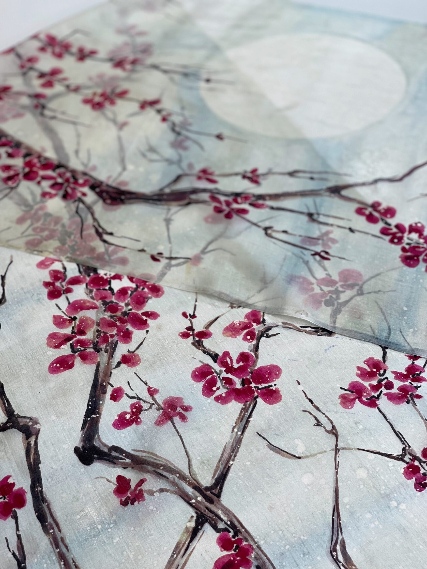 Легкими мазками серых и коричневых оттенков намечаем контуры дерева. Чистым красным красителем прорисовываем цветы вишни.